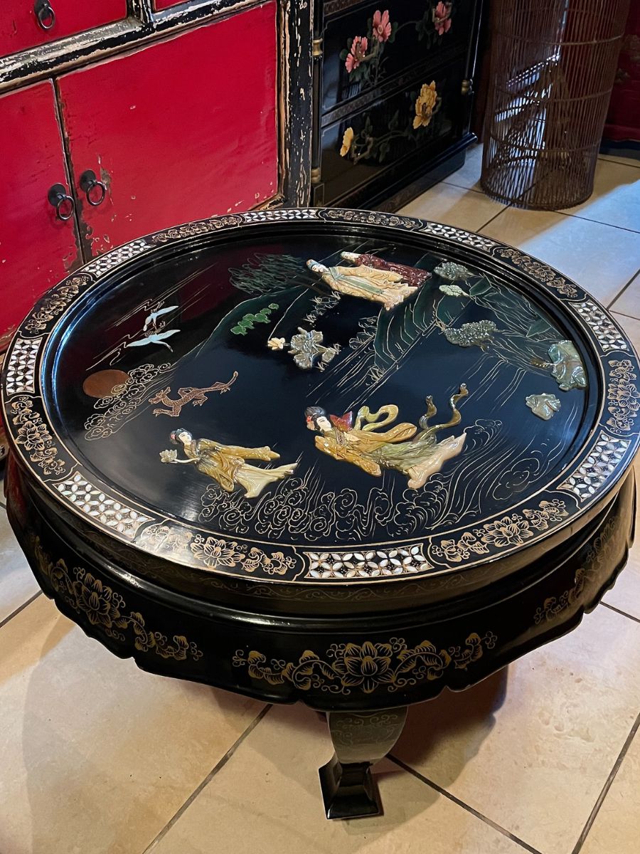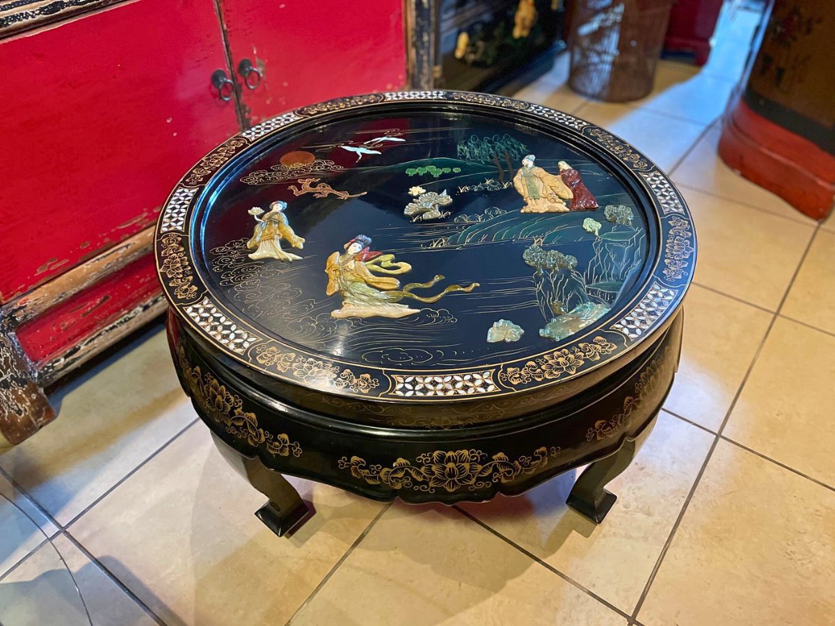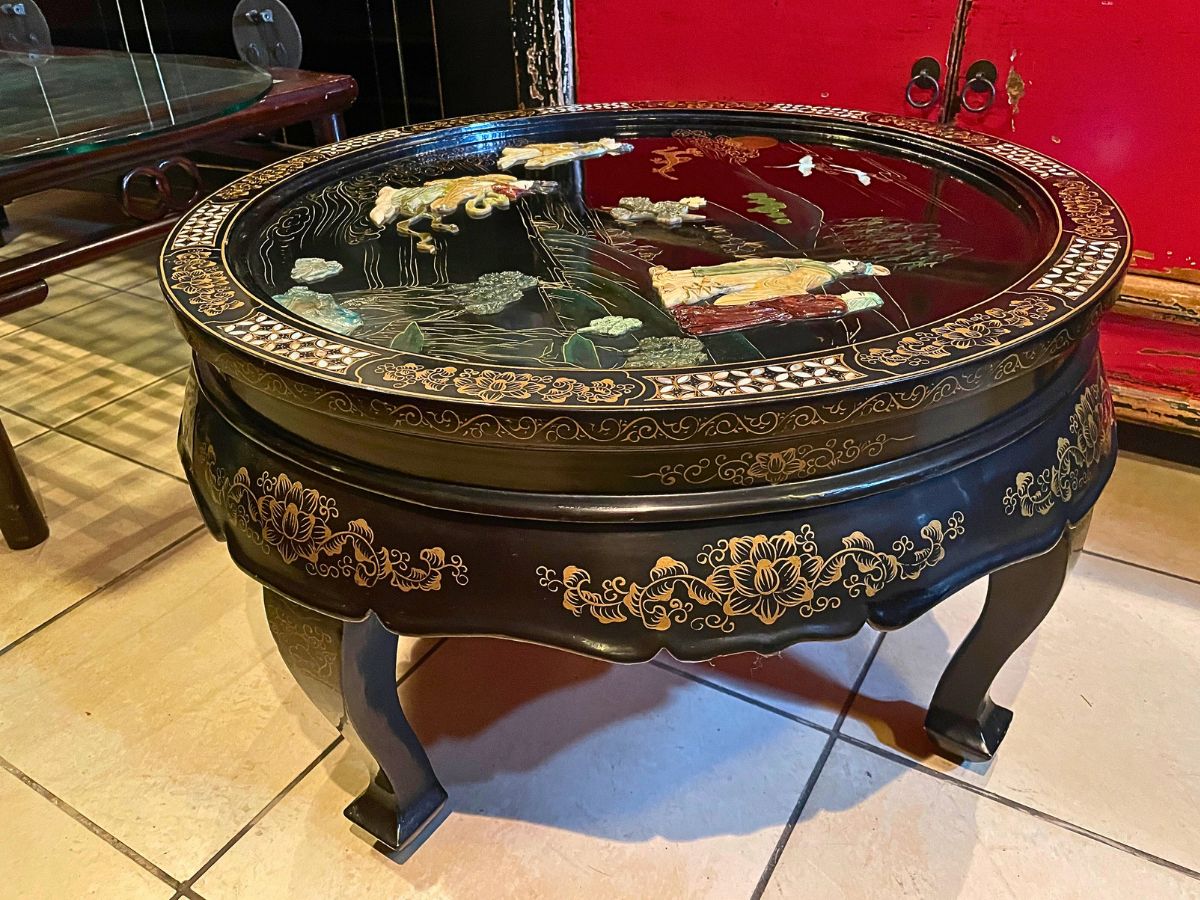 Czarny chiński stolik kawowy – kunsztowne zdobienia i tradycyjna forma