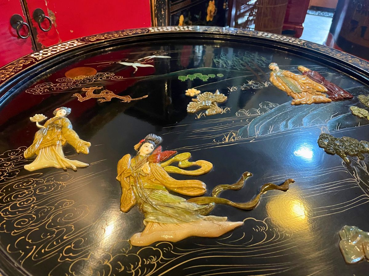 Ten luksusowy czarny chiński stolik kawowy o średnicy 76 cm stanowi wyrafinowany element wyposażenia, który łączy funkcję użytkową z dekoracyjnym charakterem orientalnego rzemiosła. Ponieważ mebel posiada głęboki, lśniący lakier, tworzy on idealne tło dla precyzyjnych aplikacji z naturalnych surowców. Rzemieślnicy ozdobili blat reliefami wykonanymi z masy perłowej oraz kamieni, które przedstawiają tradycyjne sceny rodzajowe w otoczeniu natury. W rezultacie ten unikatowy przedmiot natychmiast przyciąga wzrok i staje się centralnym punktem każdego luksusowego salonu. Ponadto dbałość o detale sprawia, że mebel ten zadowoli najbardziej wymagających kolekcjonerów.